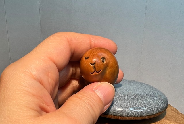 つげ(黄楊)材 4cm 柳之と柳香の銘入り 秋波(しゅうは)とはウインクのこと。女性の色目の意味もありますが、ちょっとボーイッシュな顔つきです。彫り始めは鳥のイメージでしたが、途中からアザラシのようなものに変えたので、ゆるキャラのような楽しくて摩訶不思議な作品に仕上がりました。握り具合もよく、形も実用的なので、普段使いにおすすめです! 実はこの作品、数年前に父・柳之が線刻のような目鼻で一旦は完成としていました。娘の私が最近「もっと目鼻を深くした方がよいのでは?」と言いましたら、「じゃあお前がやってみたら?」と言われて仕上げました。(父の作品に刀を入れるなんておこがましいなぁと思いながらも、父の指導のもと、何とか続きの彫りと着色をすることができました。) というわけで、わたしども父娘の初のコラボ作品。しかも、彫刻歴80年近い父にとって(分業以外での)初の合作、私にとって雅号・共香(ともか)改め柳香(りゅうこう)での初作品という、初めて尽くしの珍品です!