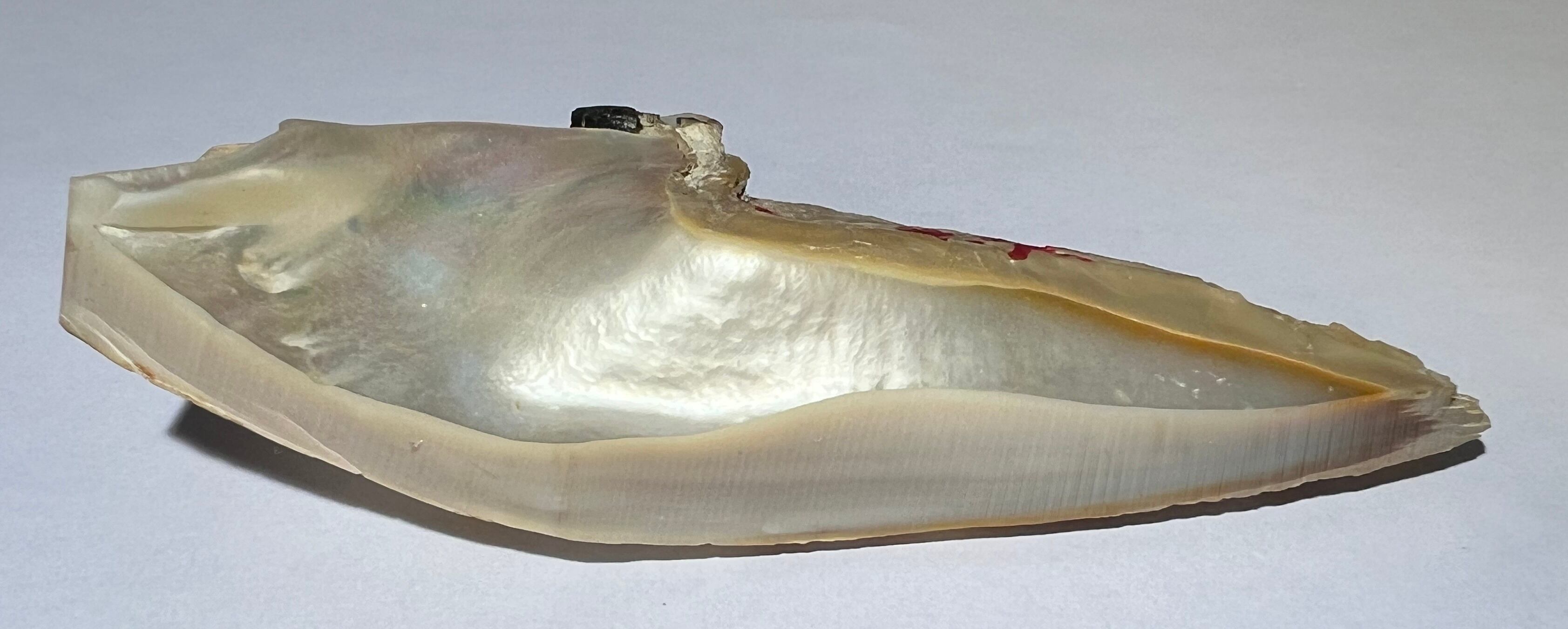 白蝶貝の一部分ですが、厚みがあります。螺鈿などの材料にするもよし、厚みや形を利用してオブジェにするもよし、アイデア次第でいろいろな使い方ができそうです。