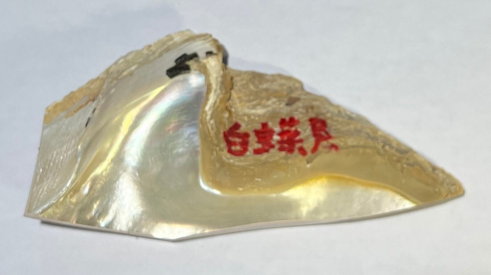 根付作家・駒田柳之が材料の見本として持っていたものです。そのため、赤ペンで「白蝶貝」と書き込んであります。