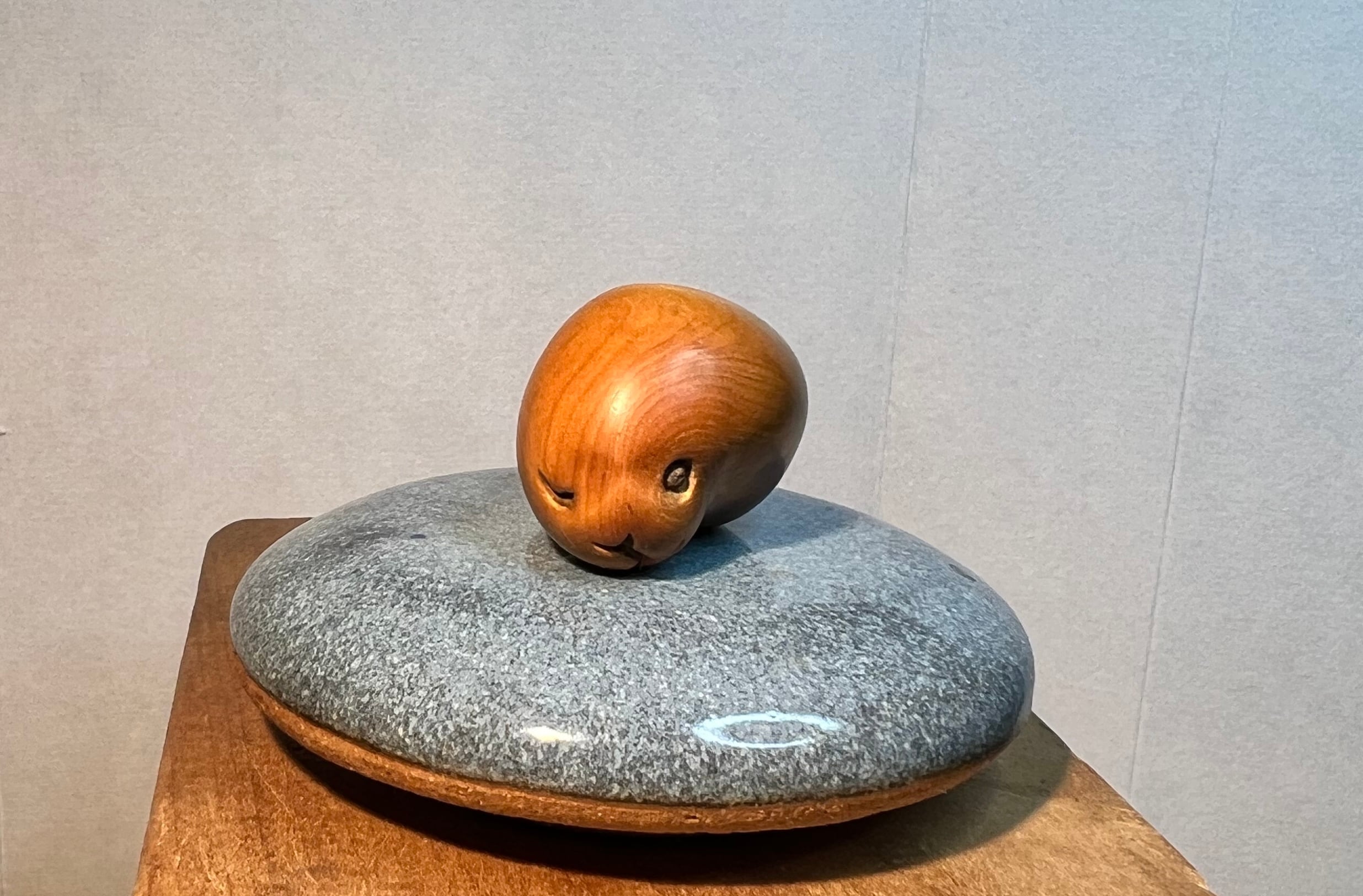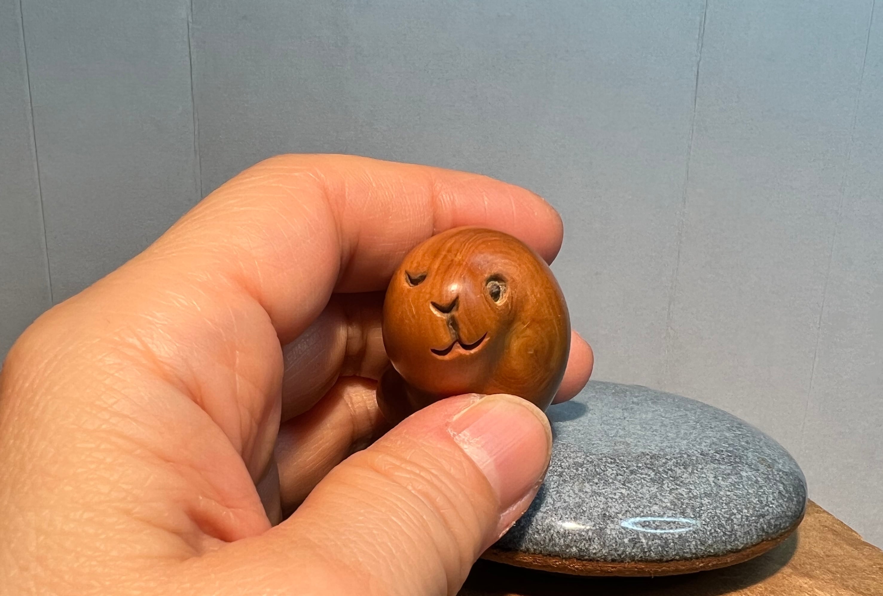 実はこの作品、数年前に父・柳之が線刻のような目鼻で一旦は完成としていました。娘の私が最近「もっと目鼻を深くした方がよいのでは?」と言いましたら、「じゃあお前がやってみたら?」と言われて仕上げました。(父の作品に刀を入れるなんておこがましいなぁと思いながらも、父の指導のもと、何とか続きの彫りと着色をすることができました。)