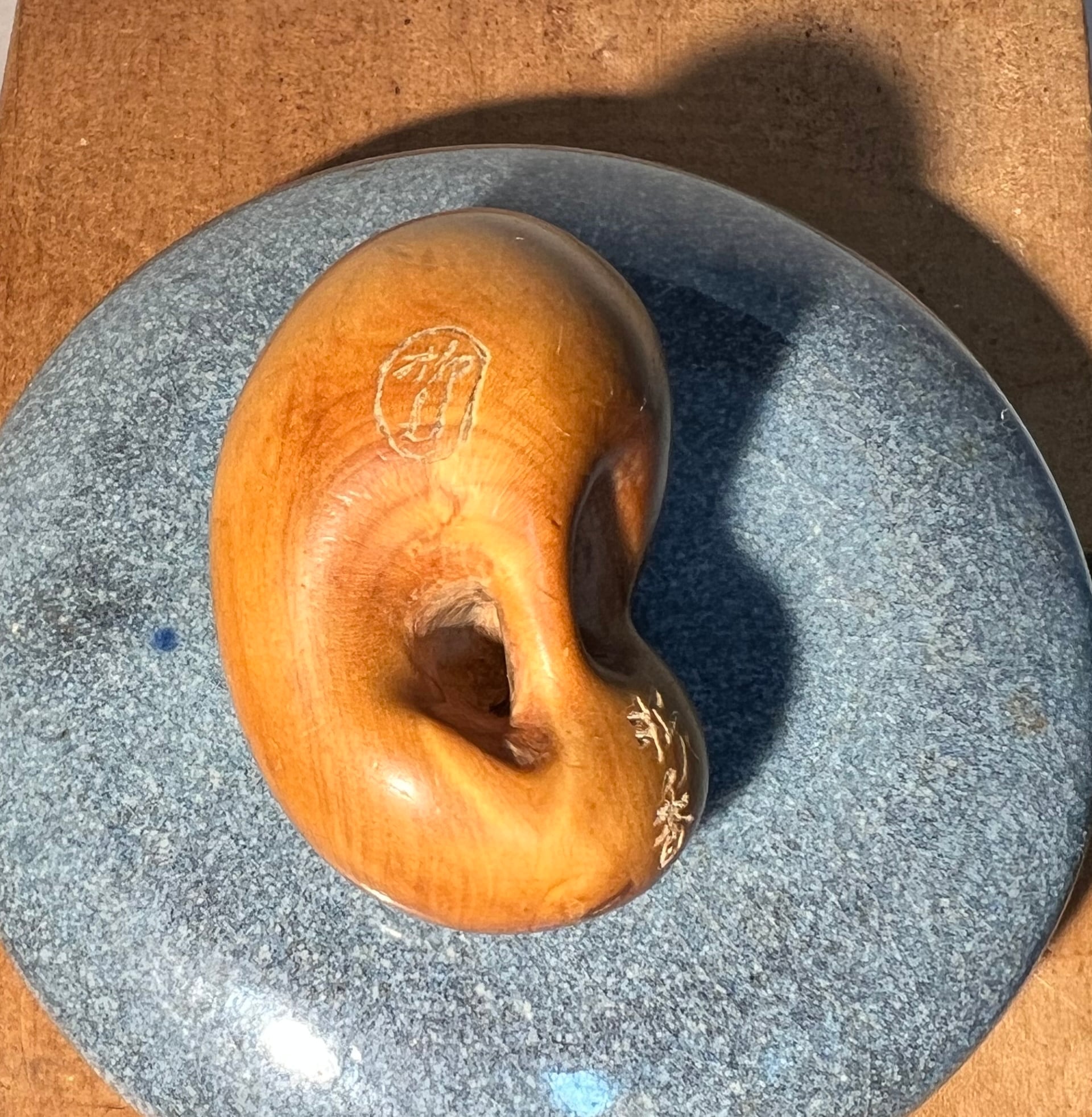 秋波(しゅうは)とはウインクのこと。女性の色目の意味もありますが、ちょっとボーイッシュな顔つきです。彫り始めは鳥のイメージでしたが、途中からアザラシのようなものに変えたので、ゆるキャラのような楽しくて摩訶不思議な作品に仕上がりました。握り具合もよく、形も実用的なので、普段使いにおすすめです!