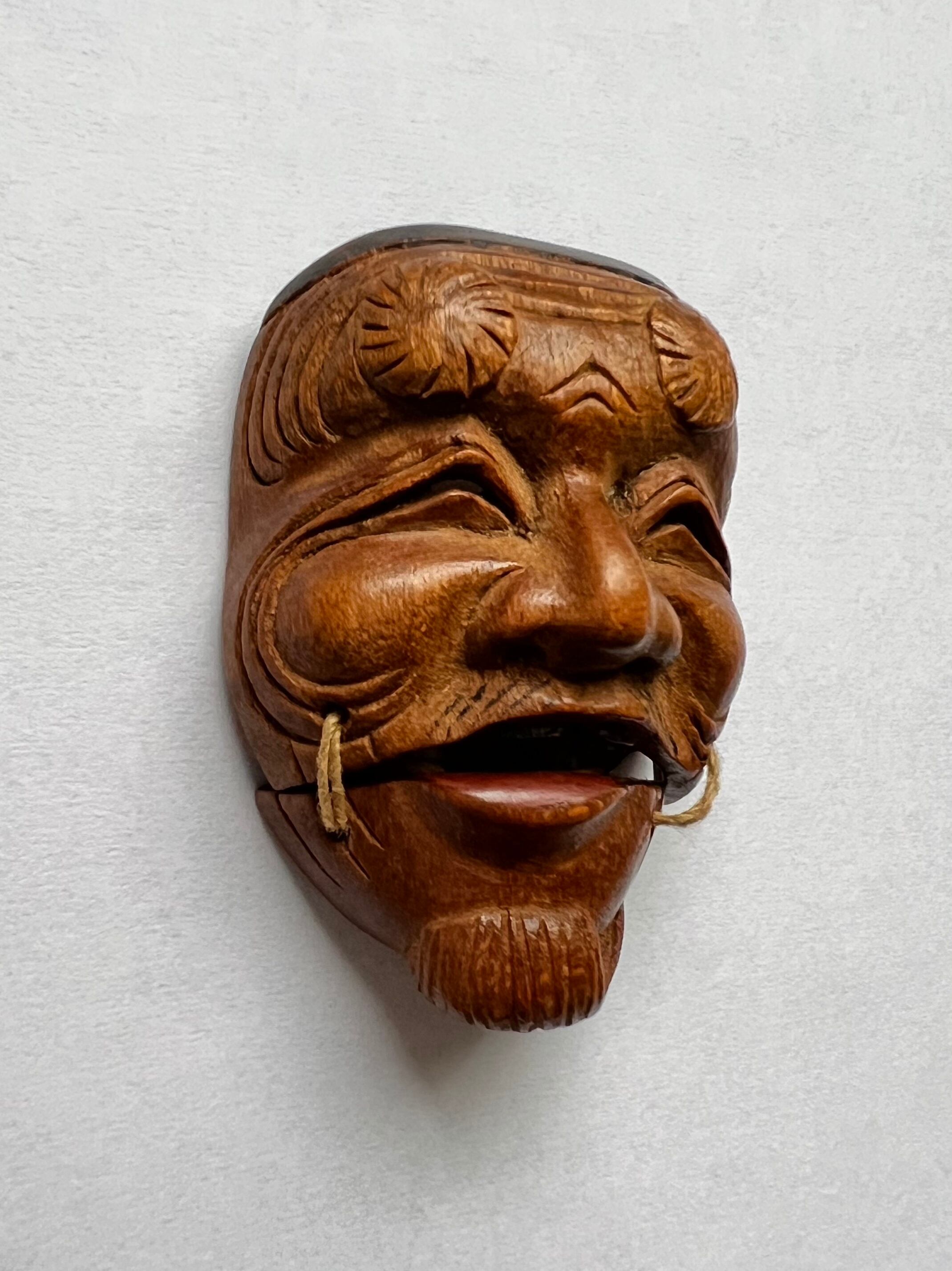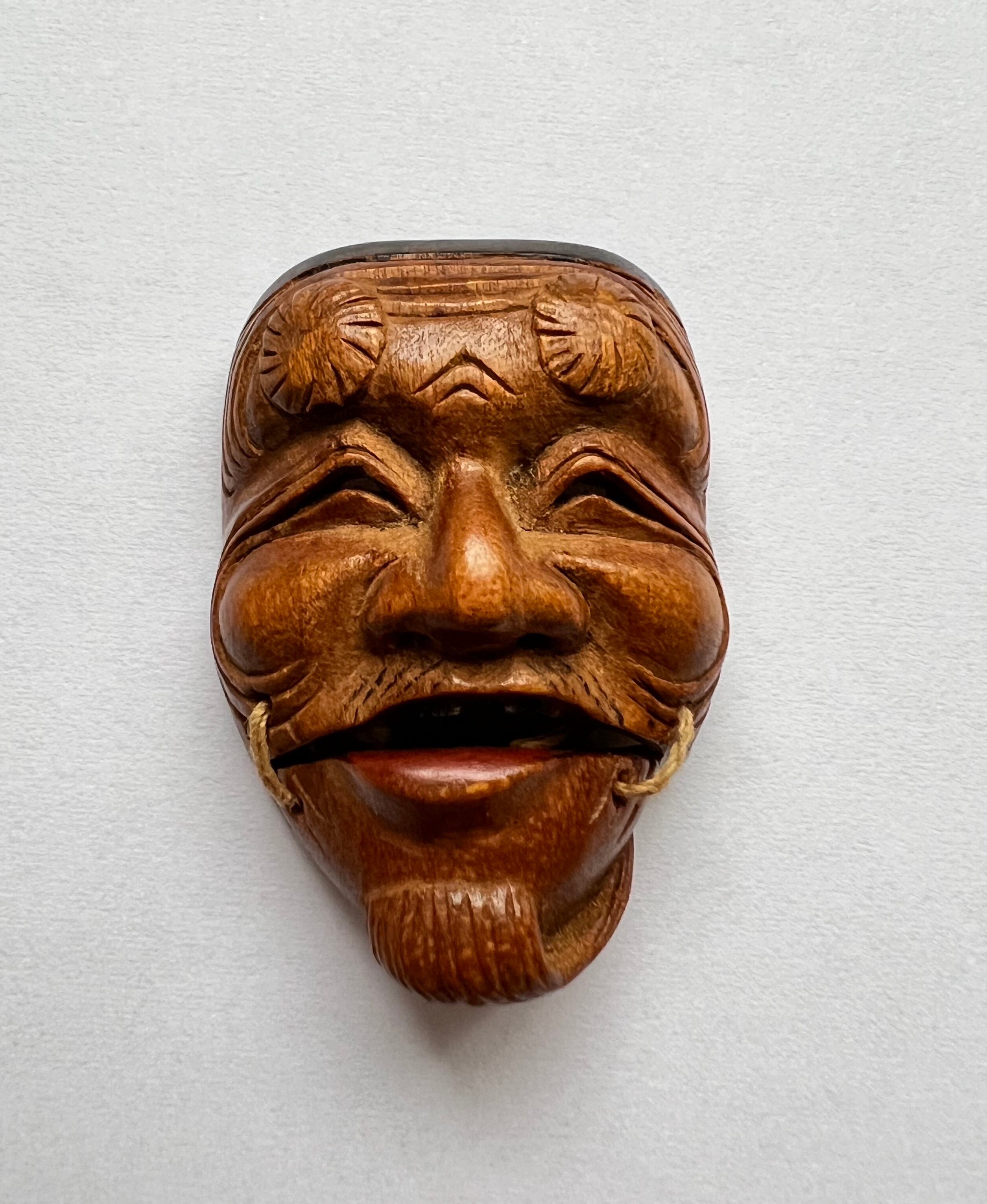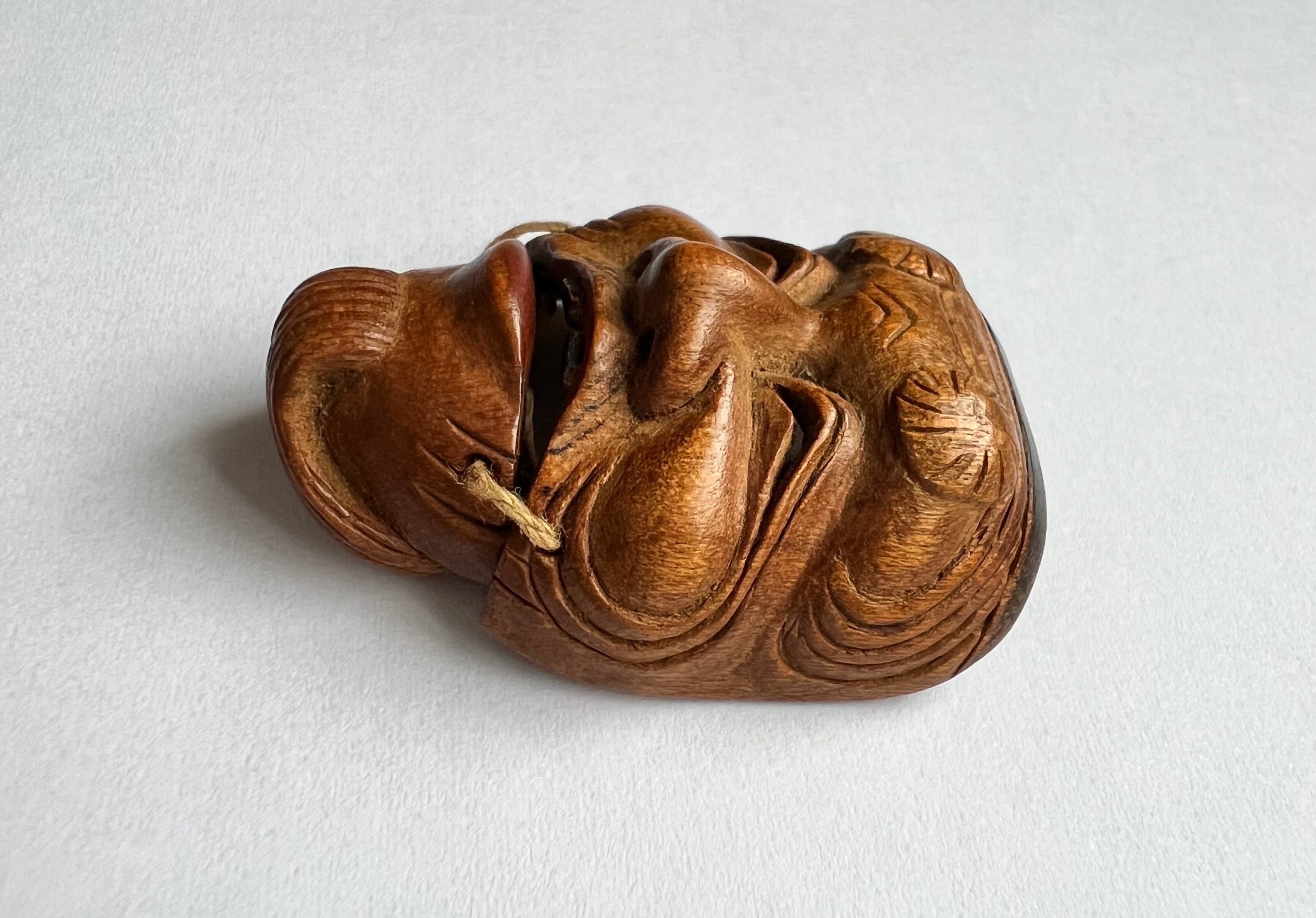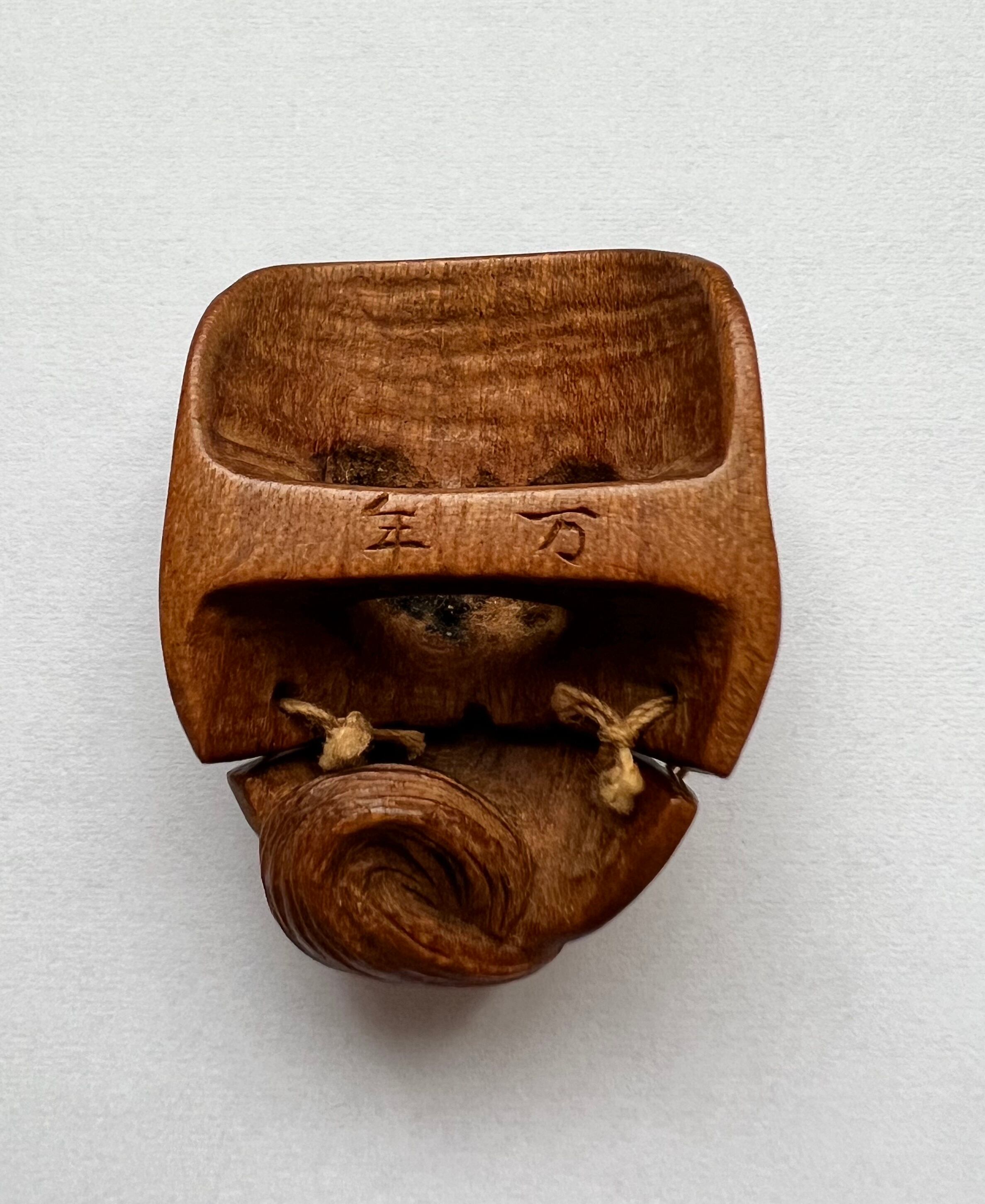 翁(おきな)の面をかたどった江戸時代の根付です。万年の銘が入っています。