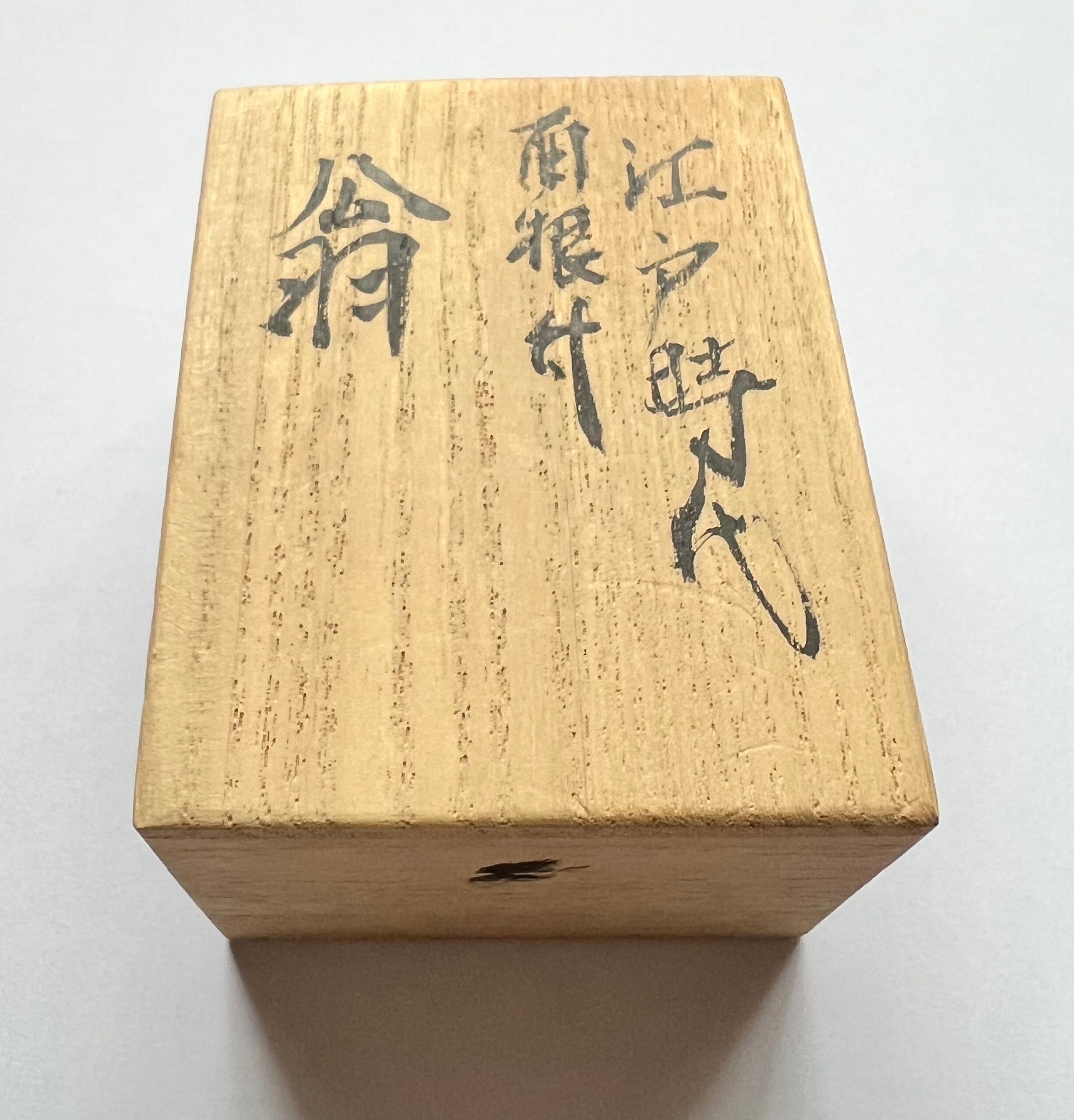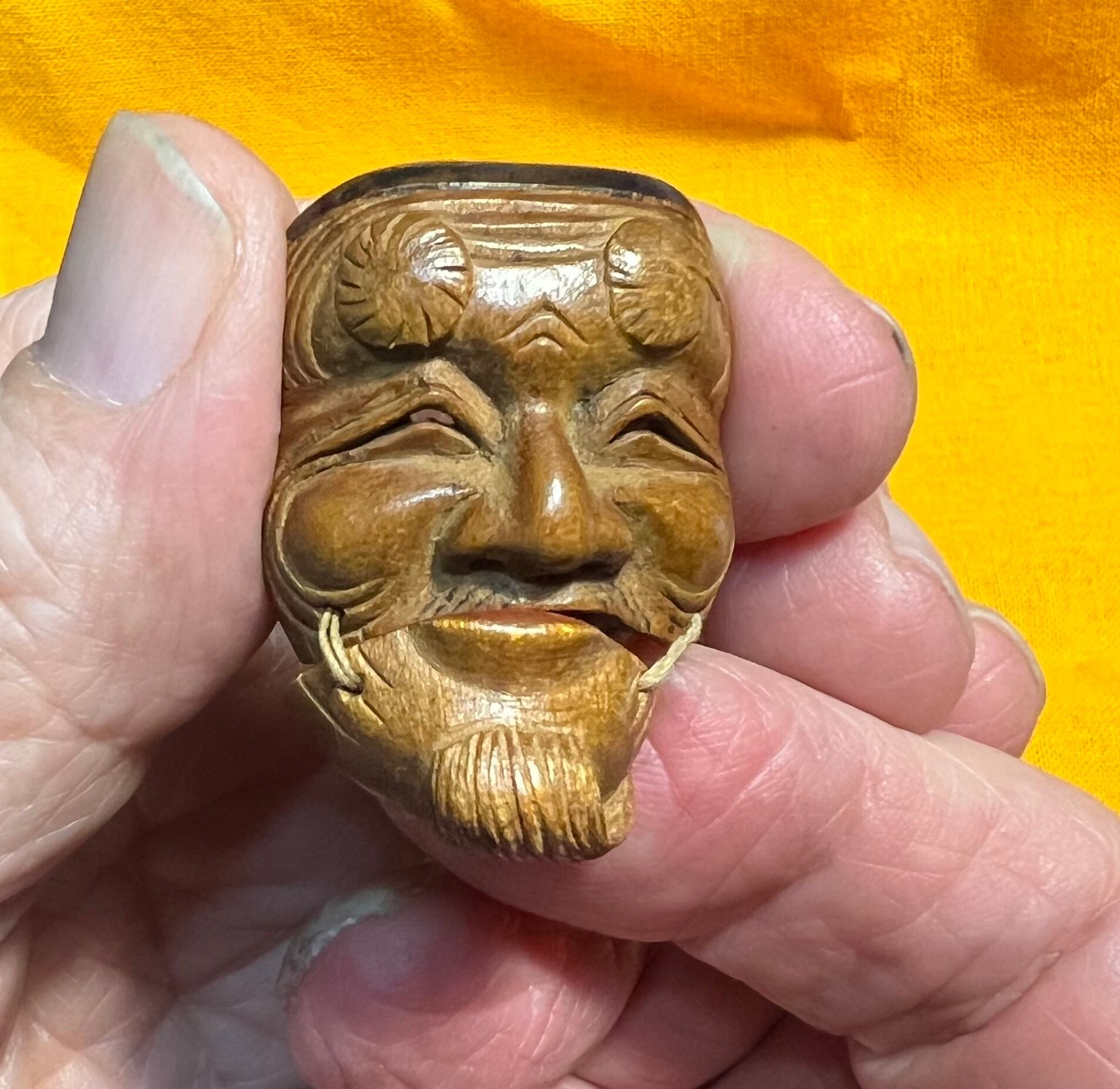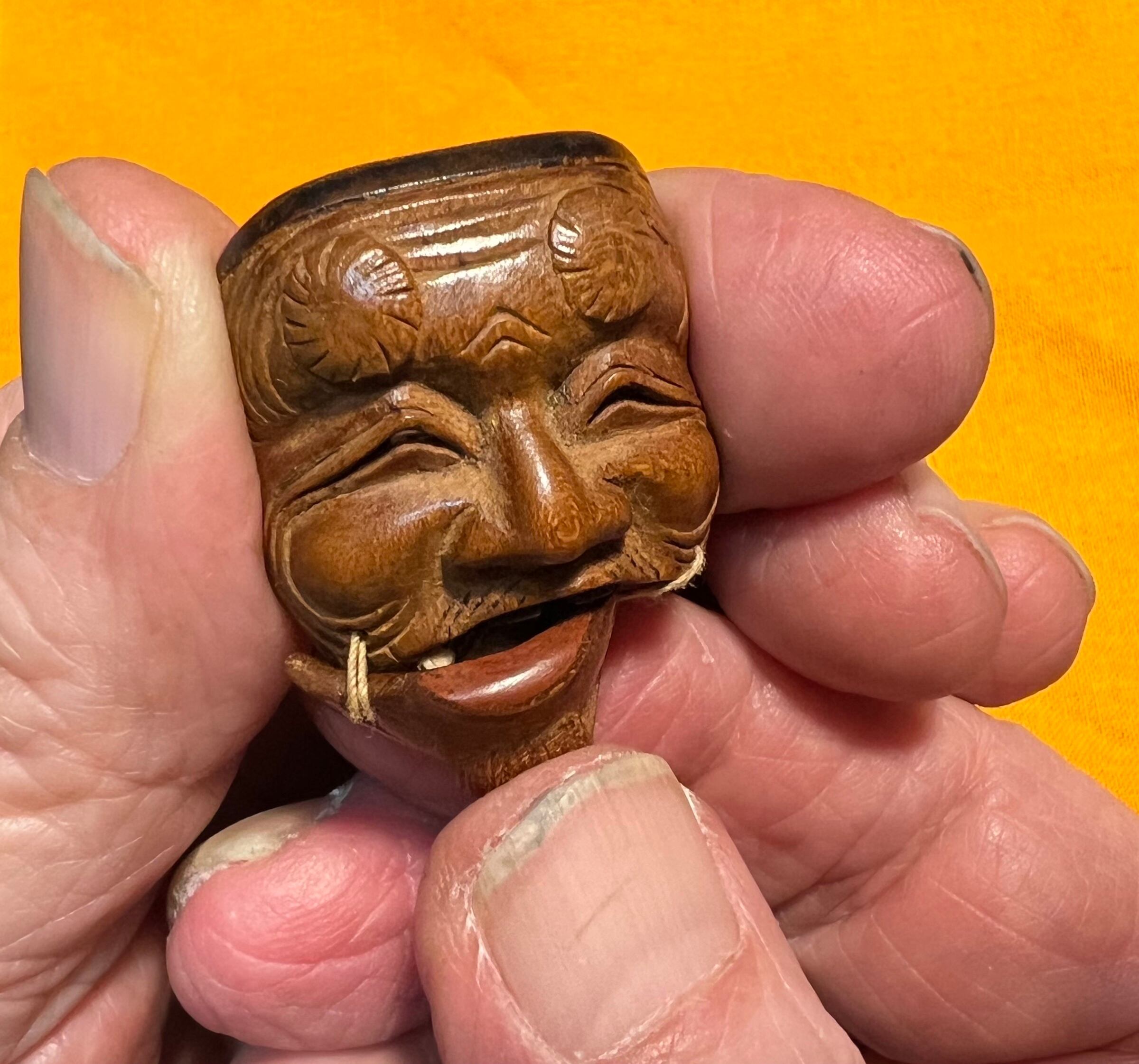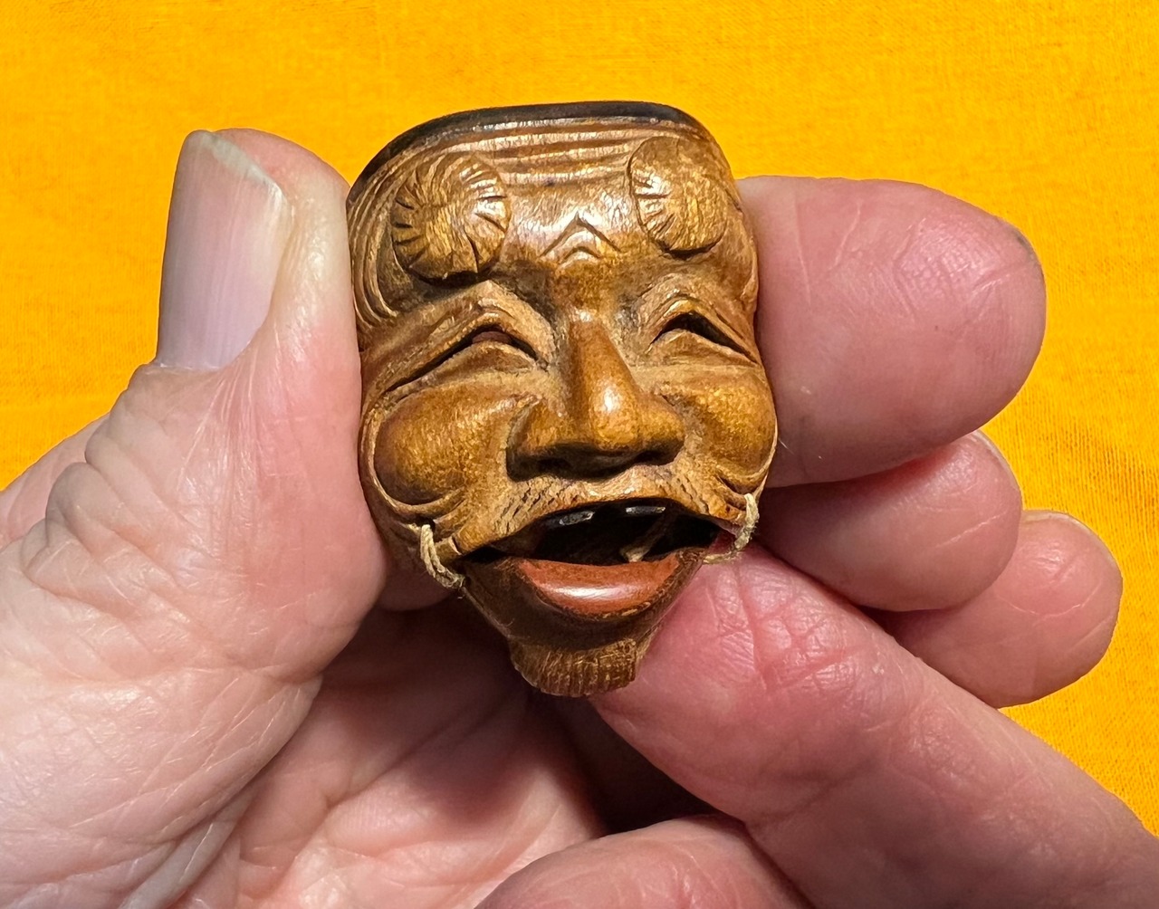 翁(おきな)の面をかたどった江戸時代の根付です。万年の銘が入っています。