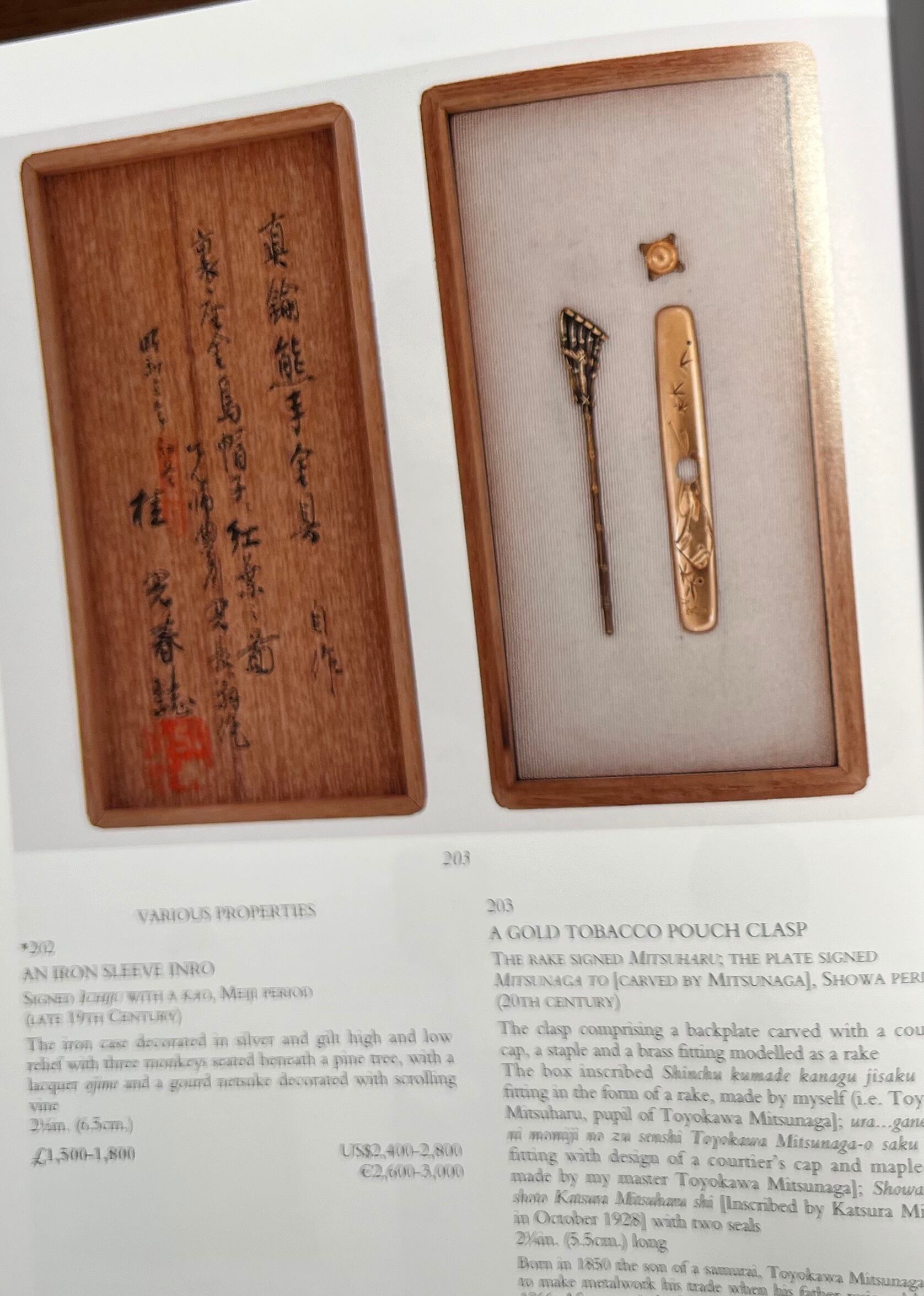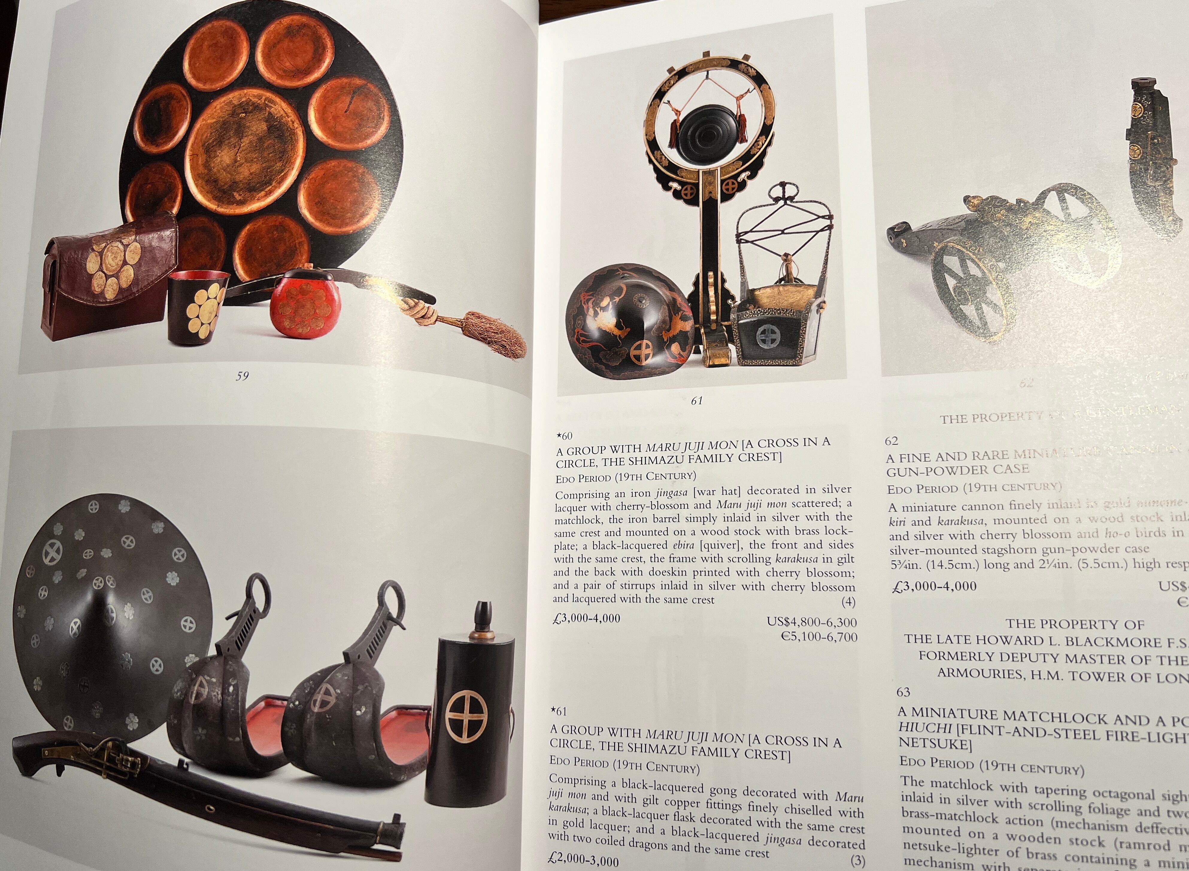 武具甲冑などがお好きな方におすすめです。根付と印籠は各30点程度で少ないです。また、埴輪などの土器があるかと思えば、陶磁器、漆芸品、七宝焼といった主に明治期の工芸品までバラエティに富んだ品物が掲載されています。